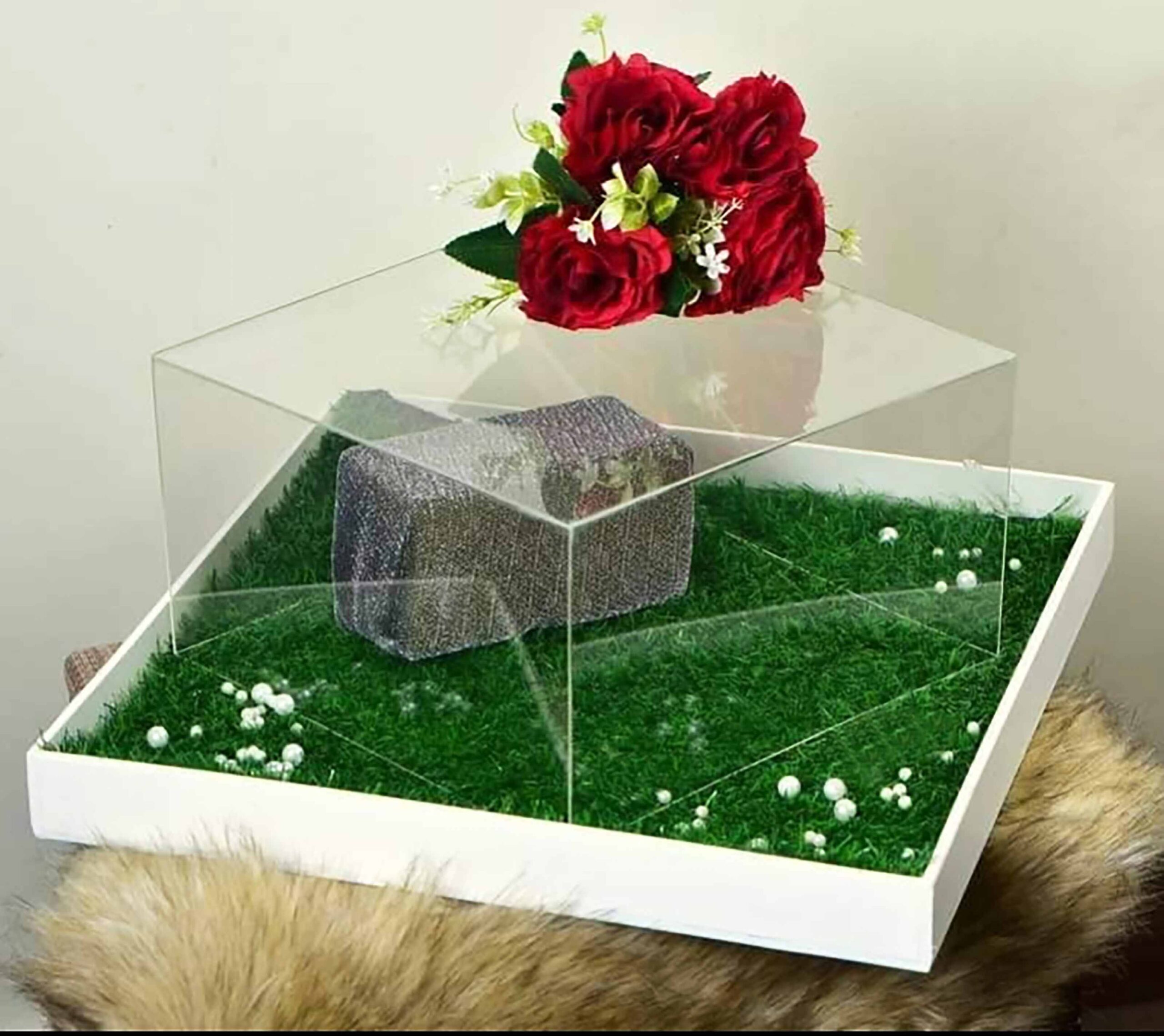 - 🪜Size:Ground 15X15 inch, Deep 2 inch wood frame. Glass cover (Width 15X15 inch, Height 12 inch), green carpet.